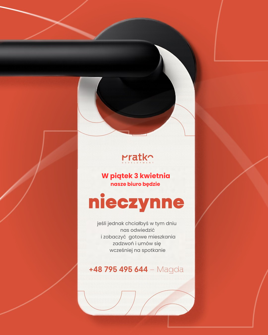 Informujemy, że w dniu 3 kwietnia biuro sprzedaży będzie nieczynne. W tym dniu istnieje jednak możliwość obejrzenia gotowych mieszkań przy ul. Legionistów 12 – po wcześniejszym umówieniu wizyty telefonicznie z naszą koordynatorką Magdą. Zapraszamy do kontaktu tel. 795 495 644