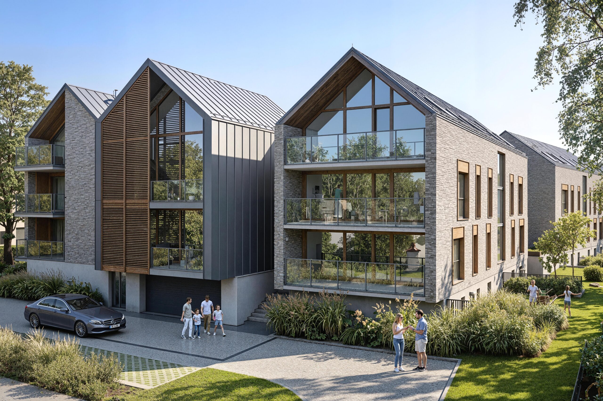 The priority in shaping the interior layout was ergonomics and the ability to flexibly adapt the apartment functions to individual needs. On the ground floor, garages were designed along with an additional parking space in front of the building and storage units. The upper floors include both single-level apartments with spacious terraces and private gardens, as well as two-level units featuring an additional master bedroom and a comfortable rooftop terrace.