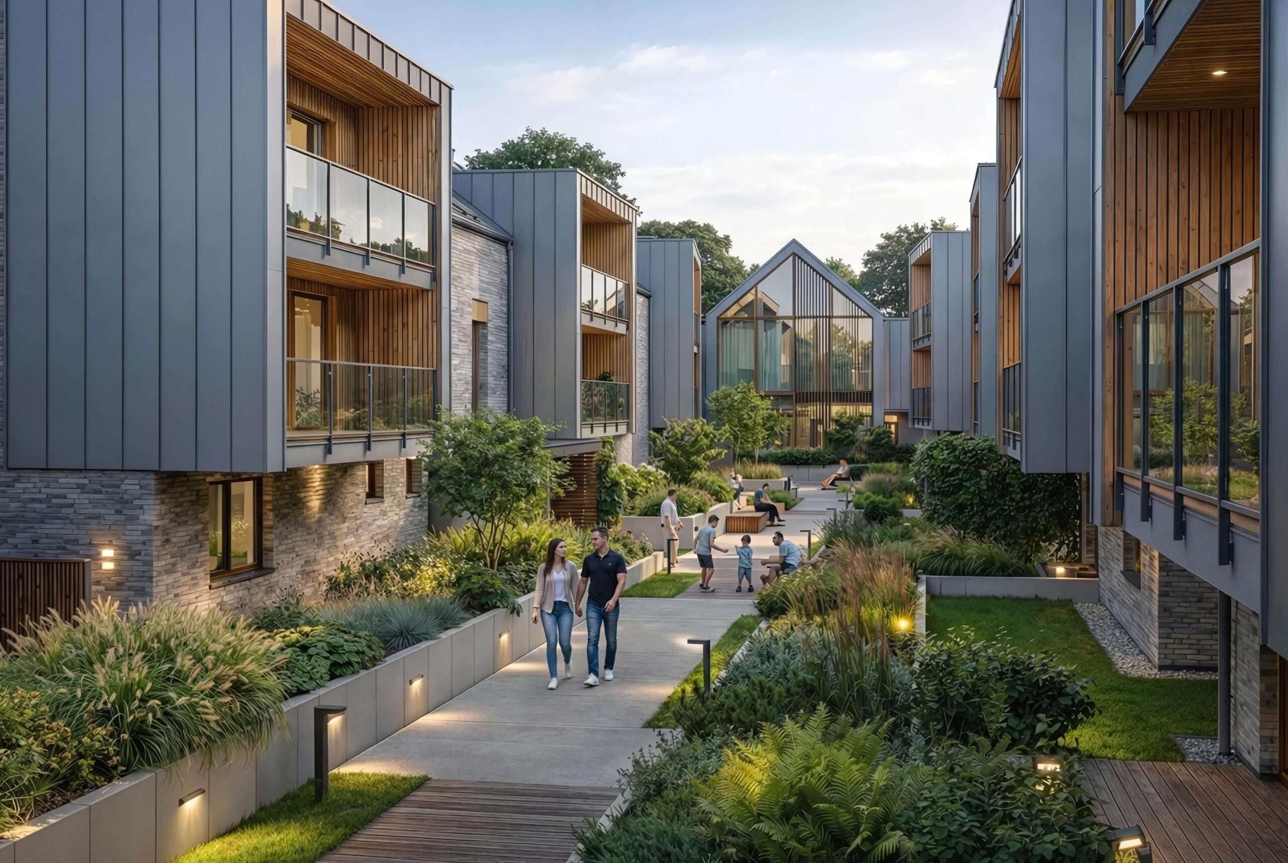 The project is based on two rows of terraced buildings which, through the site’s configuration, create an intimate urban interior, visually enclosed by dense tree cover located on the neighboring plot. The central axis of the development is formed by an internal communication route in the form of a wide pedestrian and vehicular pathway.