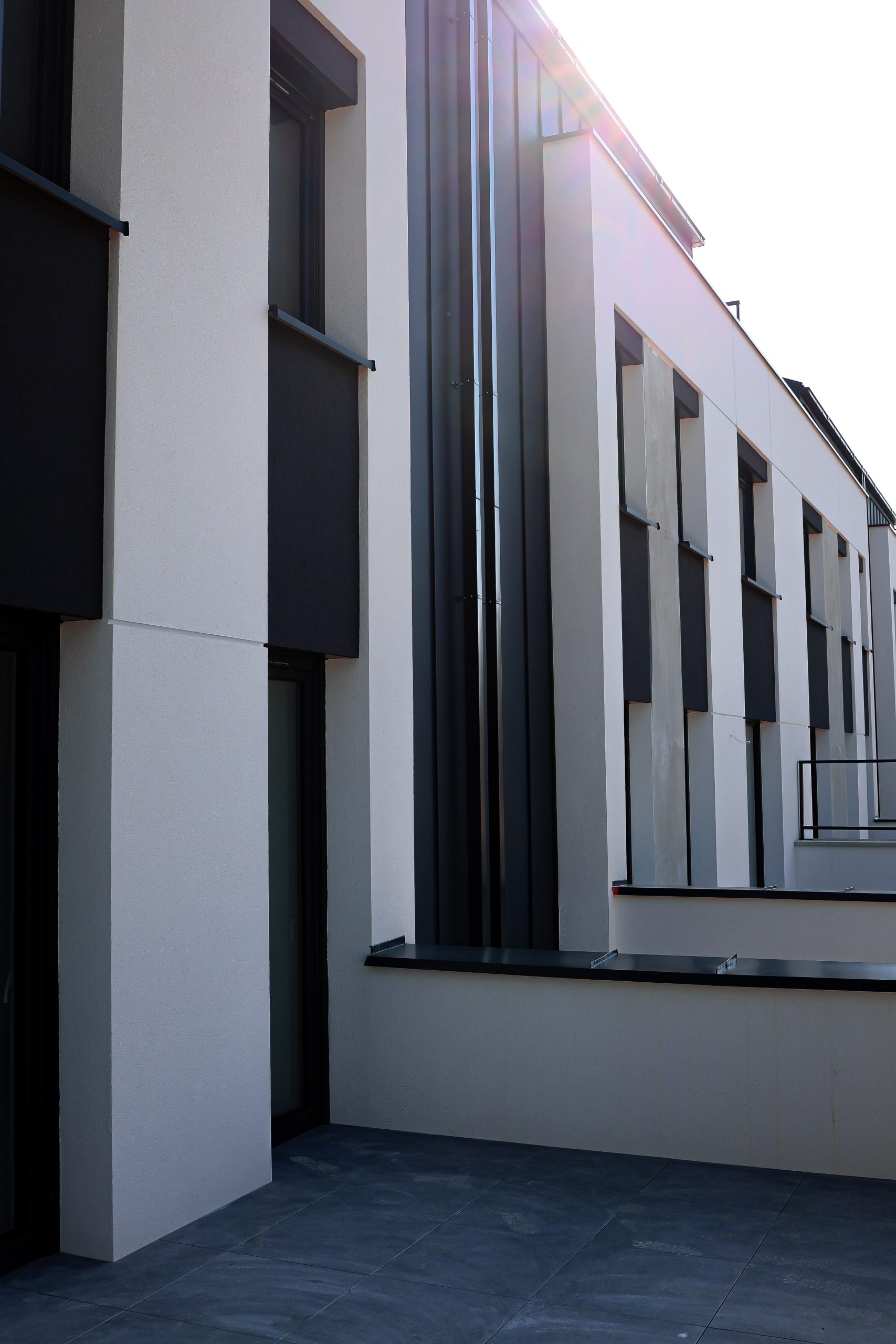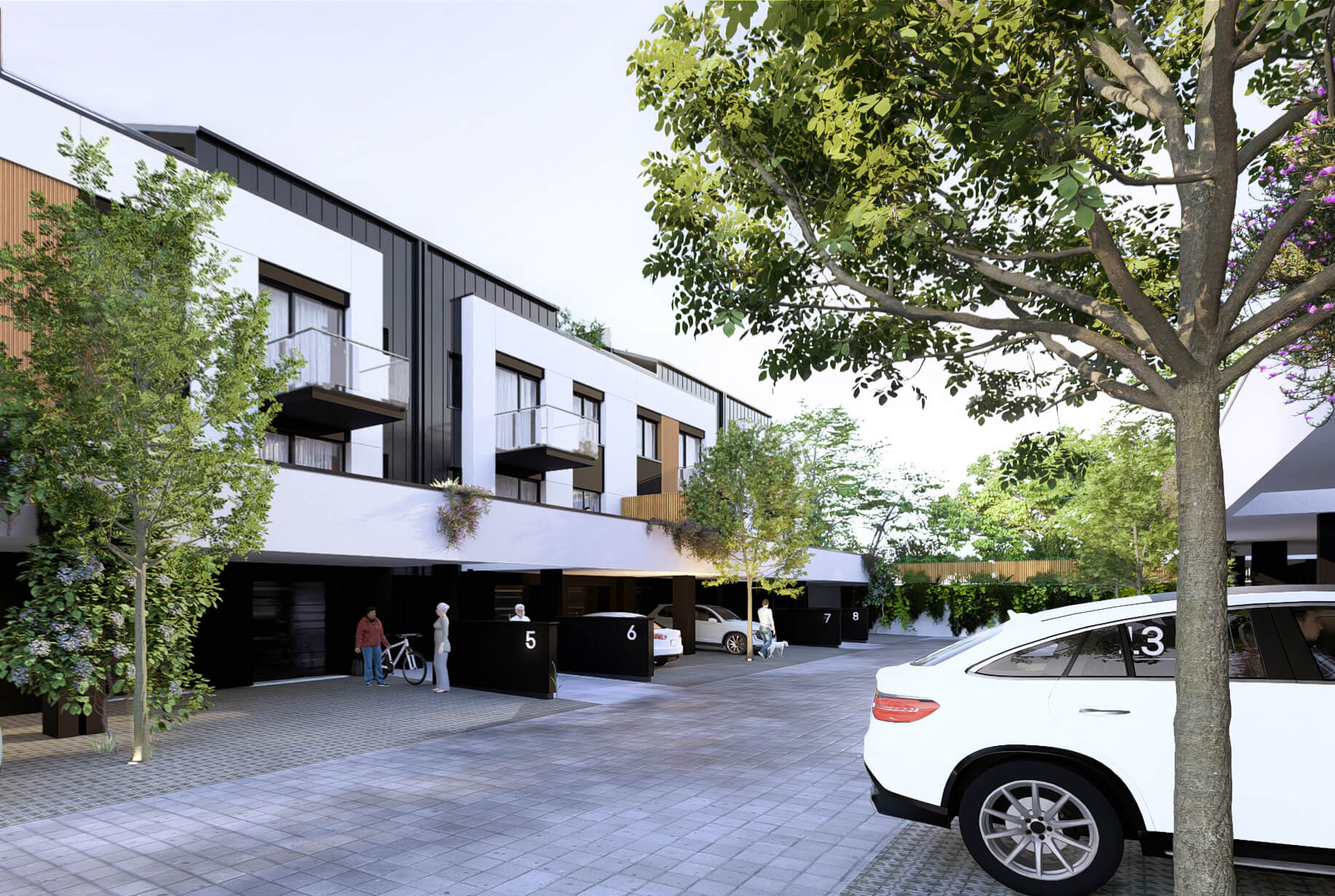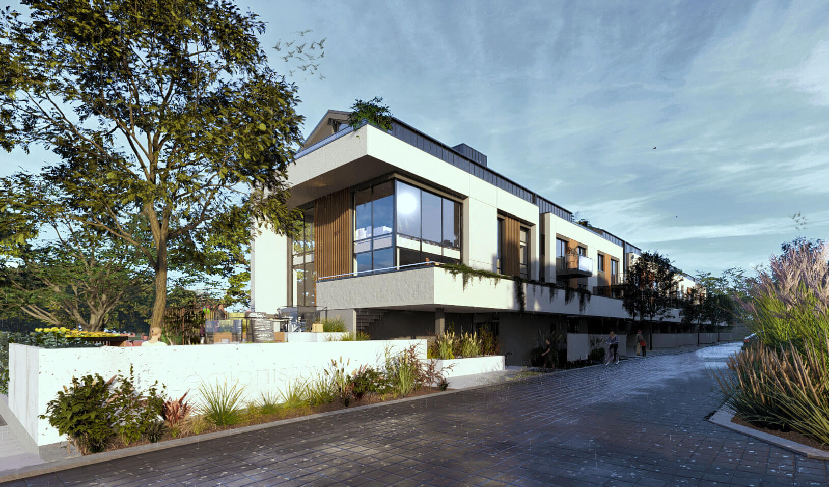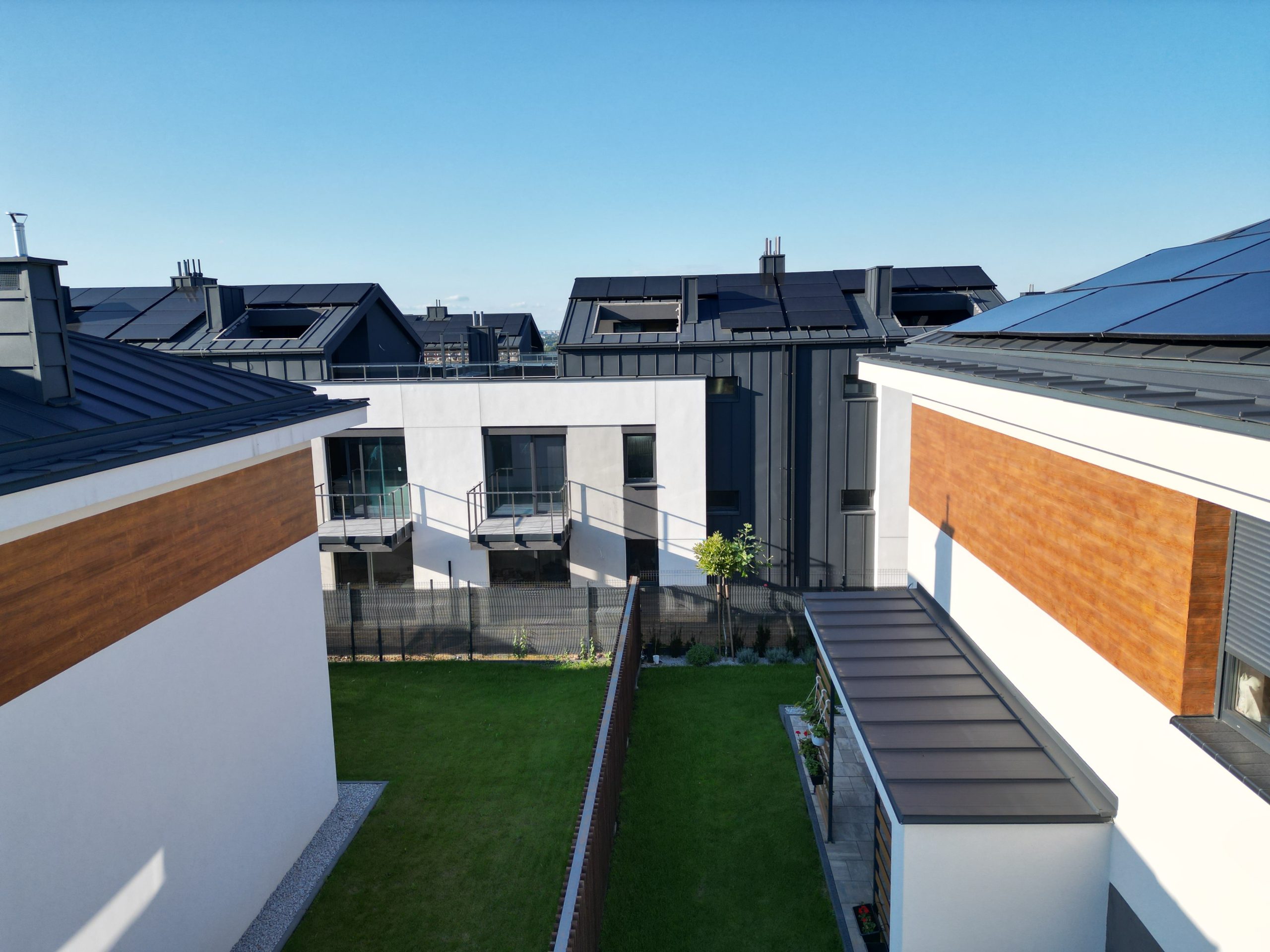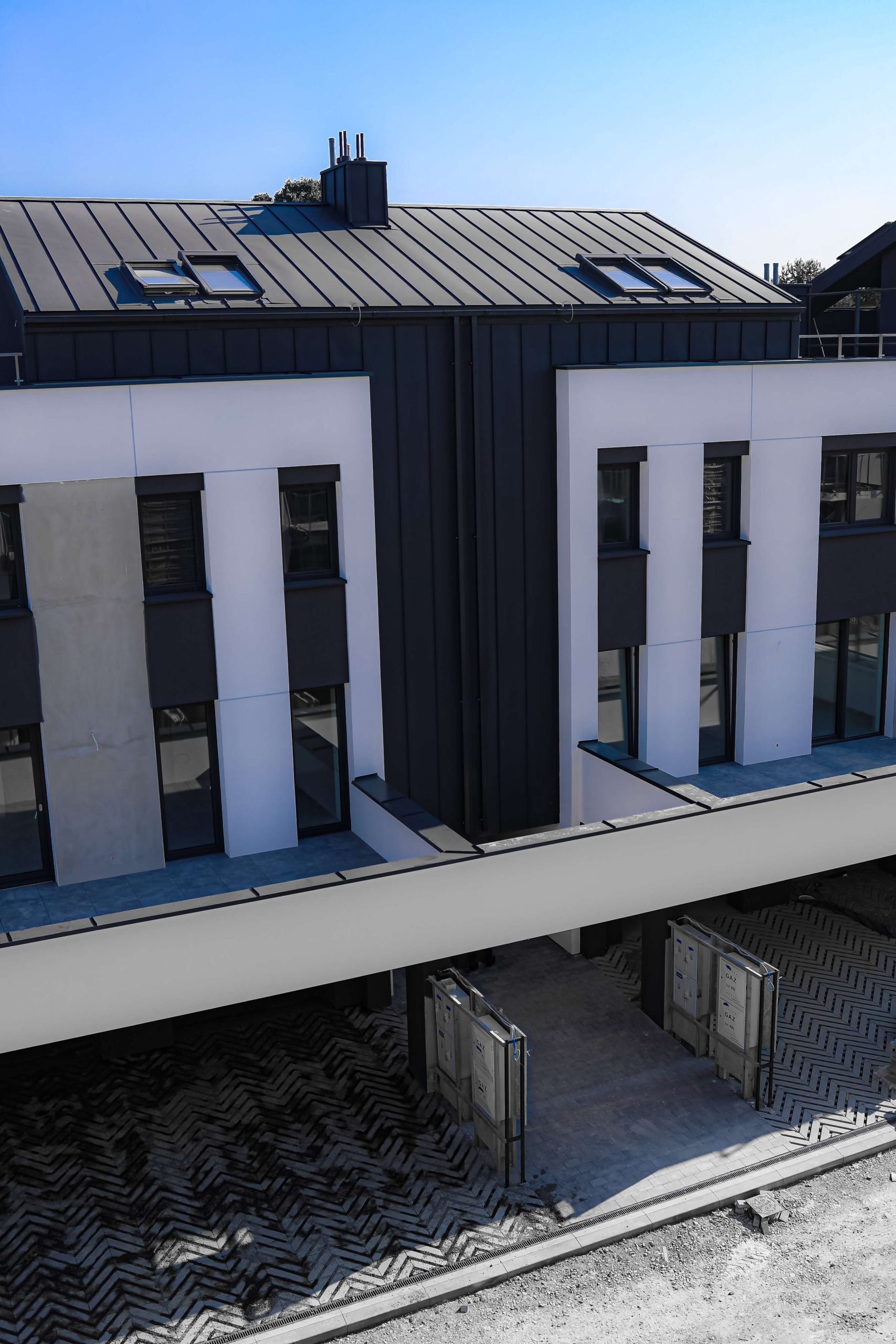 Projekt zakłada budowę dwóch zespołów budynków łączonych szeregowo, o współczesnej architekturze złożonej z prostych form i czytelnej kompozycji, nawiązujących do charakteru sąsiadującej zabudowy poprzez zastosowanie zbliżonych kolorystyki i pochyleń głównych połaci dachów.