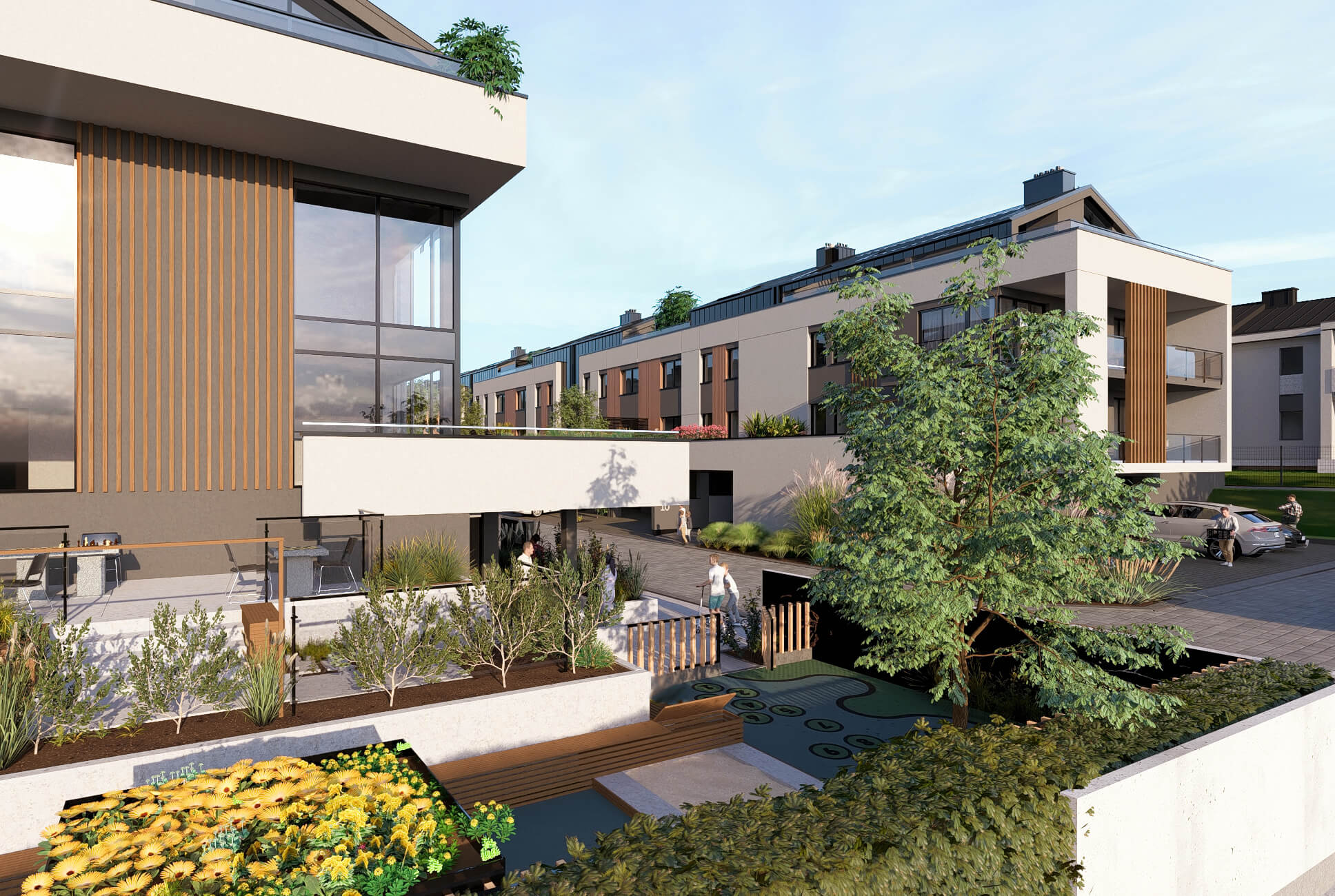 Każde mieszkanie posiada przypisany ogródek lub taras, które stanowią idealne miejsce do relaksu i spędzania czasu na świeżym powietrzu. Nasza inwestycja oferuje zadaszone miejsca postojowe przed garażami wbudowanymi, zapewniając wygodę i ochronę pojazdów. Osiedle dysponuje własną strefą usługową, w której znajduje się niewielki sklep, kawiarnia oraz przestrzeń integracji społecznej, tworząc przyjazne i funkcjonalne miejsce do życia.