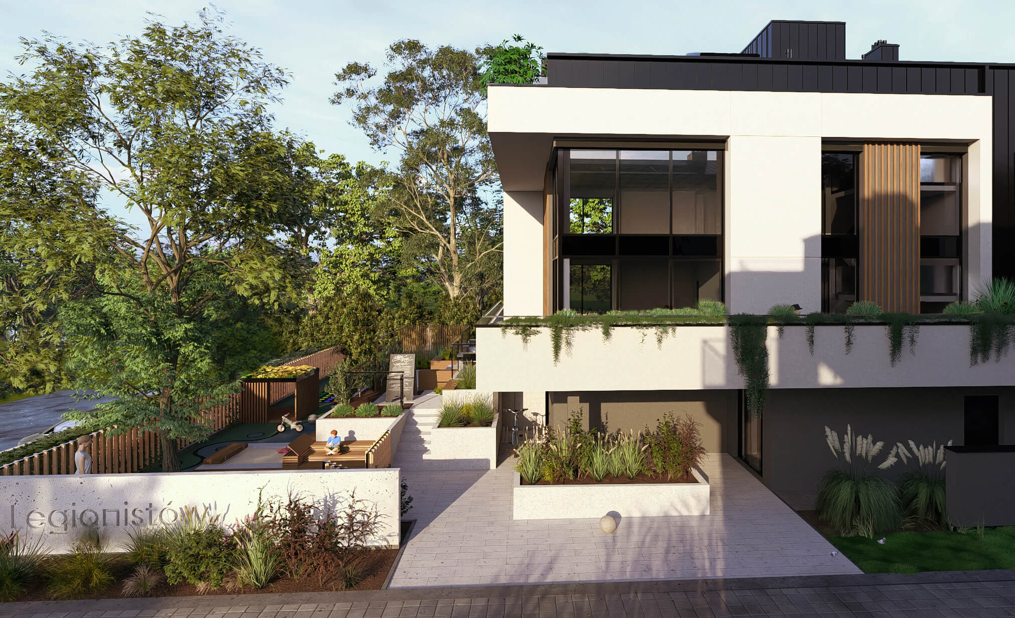 Na inwestycji LEGIONISTÓW zaplanowano mały budynek usługowy, który będzie mieścił restaurację oraz plac integracji społecznej z placem zabaw dostępnym dla wszystkich mieszkańców. Dodatkowo, na osiedlu znajdować się będzie mały osiedlowy sklepik oraz dwa lokale usługowe dedykowane pod strefę beauty. Na terenie osiedla zaplanowano również nasadzenia drzew i krzewów, co stworzy przyjazne i zielone otoczenie.